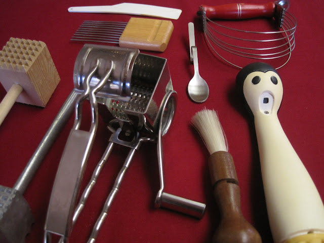 | My Favorite Gadgets (from bottom left: apple corer, meat thermometer, potato masher, nut cracker, egg slicer, 2 lid openers, cheese slicer, mini-grater, whisk) |